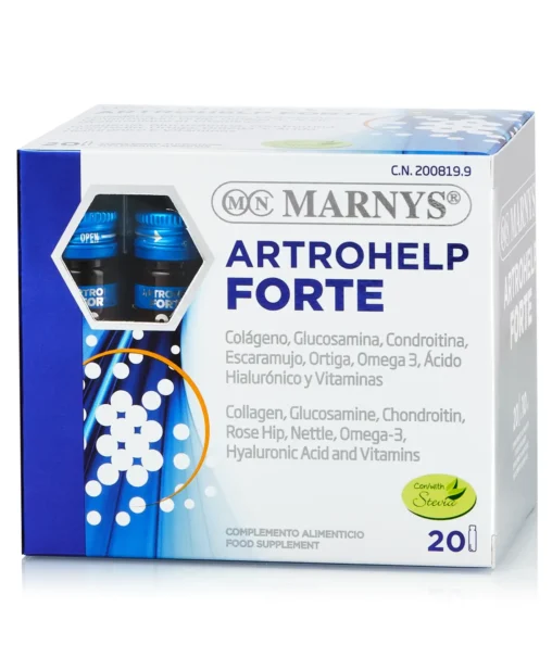 - Artrohelp Forte din gama MARNYS® este un supliment lichid care hrănește cartilajele, articulațiile și oasele, asigurându-le mobilitate, flexibilitate și elasticitate datorită combinației exclusive de Colagen Hidrolizat Enzimatic, Acid Hialuronic, Omega 3, Glucozamină, Condroitină, Măceșe, Urzică, Calciu și Vitaminele D3, K2 și E.