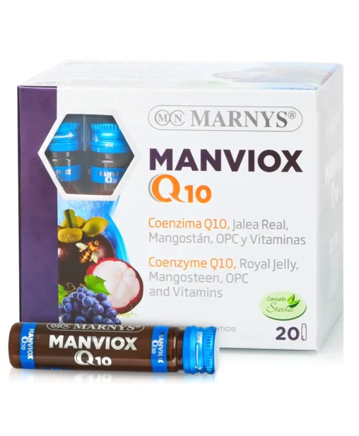 Manviox Q10 din gama MARNYS® este un supliment lichid premium, formulat pentru a sprijini sănătatea inimii și a întregului organism. Îmbogățit cu Coenzima Q10, Mangostan, Lăptișor de Matcă, Semințe de Struguri și vitamine esențiale, acest produs ajută la reducerea semnelor de îmbătrânire, îmbunătățind circulația și protejând vasele de sânge. Poate contribui la reglarea colesterolului și susține recuperarea după intervenții cardiace. Îndulcit cu Ștevie, fără gluten, lactoză sau organisme modificate genetic. Produs în Spania la cele mai înalte standarde de calitate.