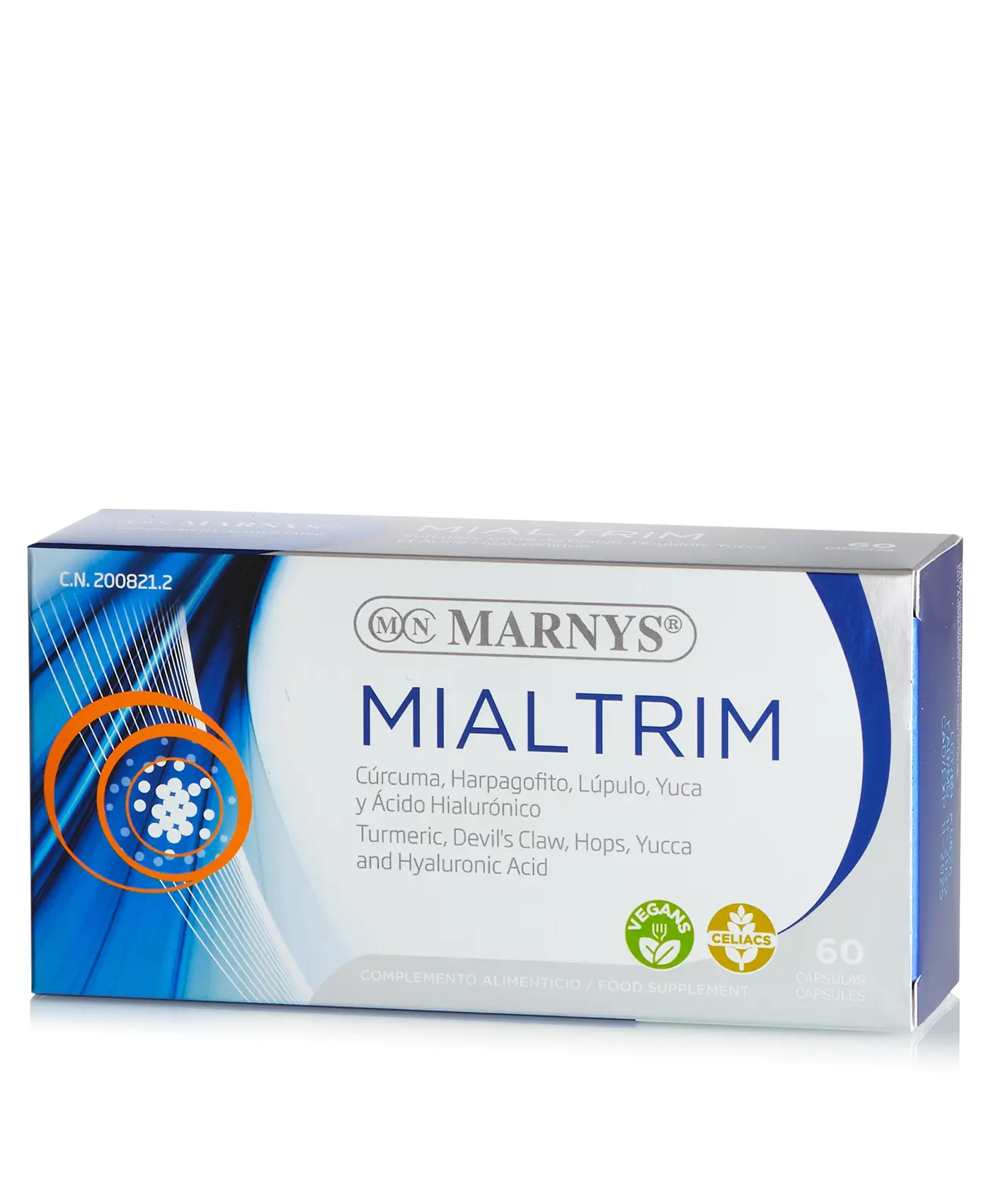 - MIALTRIM din gama MARNYS® conține o formulă exclusivă de ingrediente care susțin sistemul muscular și scheletic: Hamei, Manioc, Gheara diavolului, Turmeric, Extract de Urzică, Acid Hialuronic și Vitamina C pentru o absorție optimă și protecție antioxidantă. Datorită efectului calmant al acestora, reduce disconfortul muscular și contribuie semnificativ la ameliorarea durerilor articulare.
