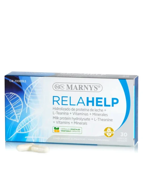 - RELAHELP din gama MARNYS® are în compoziție proteine hidrolizate din lapte (150 mg / capsulă), ingrediente care încorporează toți aminoacizii pe care corpul nostru nu este capabil să îi producă; cu alte cuvinte, aminoacizii esențiali. Se remarcă în principal prin conținutul său de L-leucină – aminoacid care favorizează dezvoltarea țesuturilor – și L-cisteină, care crește nivelul de glutation sporind activitatea antioxidantă a organismului.